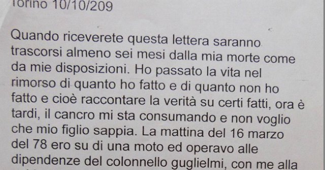 Quella lettera nell’ottobre 2009 arrivò al quotidiano La Stampa di Torino. Eccola: “Quando riceverete questa lettera, saranno trascorsi almeno sei mesi dalla mia morte come da mie disposizioni. Ho passato la vita nel rimorso di quanto ho fatto e di quanto non ho fatto e cioè raccontare la verità su certi fatti. Ora è tardi, il cancro mi sta divorando e non voglio che mio figlio sappia. La mattina del 16 marzo ero su di una moto e operavo alle dipendenze del colonnello Guglielmi, con me alla guida della moto un altro uomo proveniente come me da Torino; il nostro compito era quello di proteggere le Br nella loro azione da disturbi di qualsiasi genere. Io non credo che voi giornalisti non sappiate come veramente andarono le cose ma nel caso fosse così, provate a parlare con chi guidava la moto, è possibile che voglia farlo, da allora non ci siamo più parlati, anche se ho avuto modo di incontralo ultimamente…”.