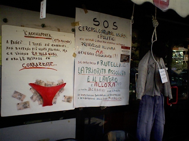 E qui arriviamo alla protesta di ieri con tanto di manichino impiccato appeso al chiosco. «Questa è la fine di chi crede nelle istituzioni», conclude Pancino. «Ma perché in Italia va avanti solo chi paga tangenti? Per questo ho attaccato il cartello in cui dico che cerco corruttori e politici. Forse è l’unico modo per ottenere qualcosa. Quello che mi fa rabbia è che nel ’91 proprio io non mi sono piegato a questo sistema e ho fatto arrestare i vertici della circoscrizione che mi avevano chiesto una “bustarella” da 20 milioni. E ora, disperato, mi tocca chiedere aiuto».