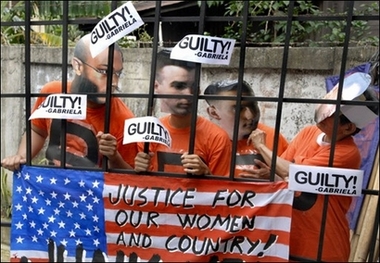Filipino activists from the Gabriela women’s organization wearing cut-outs of the four accused US Marines (L to R) Lance Corporals Dominic Duplantis, Daniel Smith, Keith Silkwood and Staff Sergeant Chad Carpentie, pose standing behind bars in Manila. The Marines accused of raping a young woman in the Philippines will learn their fate later today after a four-month trial which has evoked the face of the "ugly American" in this former US colony.(AFP/File/Romeo Gacad)