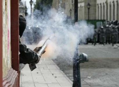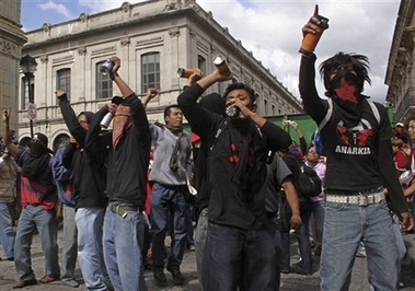 Protesters scream to federal police officers during a march in Oaxaca, Mexico, Monday, Nov. 20, 2006. Mexico’s Federal Preventive Police used tear gas on Monday to disperse members of the Popular Assembly of the People of Oaxaca (APPO) as they continued their protests demanding the resignation of Governor Ulises Ruiz. (AP Photo/Luis Alberto Cruz)