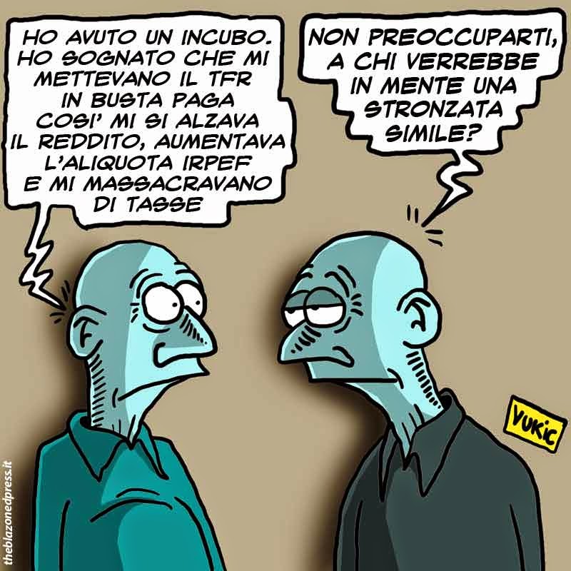 Per questo ci ha colpito la vignetta di Vukic che riportiamo qui a fianco, che interviene sul recente annuncio del governo di voler aggiungere da fine anno 100€ al mese in busta paga di TFR. Che non è altro che la famosa liquidazione di fine rapporto (e già qui, come per i famigerati 80€, si segherebbero dal provvedimento autonomi e partire IVA), in ogni caso già spettante ai lavoratori.