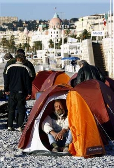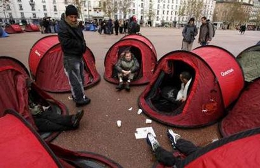 Homeless people chat in their tents in central Lyon January 2, 2007. The French association ’Enfants de Don Quichotte’ (Children of Don Quichotte) set up the tents Tuesday to draw attention to the need for long-term accommodation solutions for the city’s homeless. REUTERS/Robert Pratta (FRANCE)