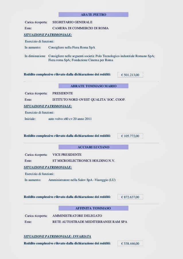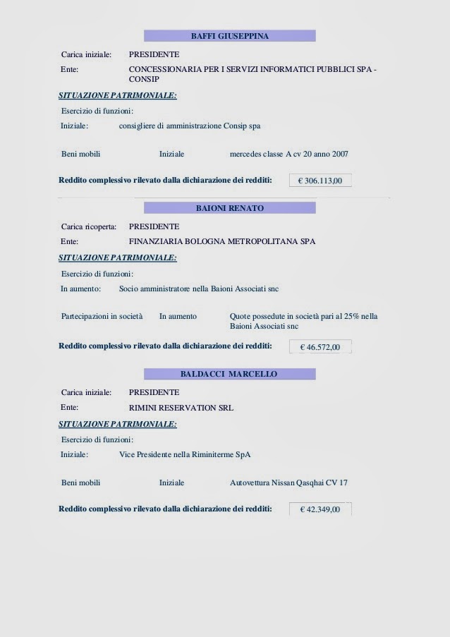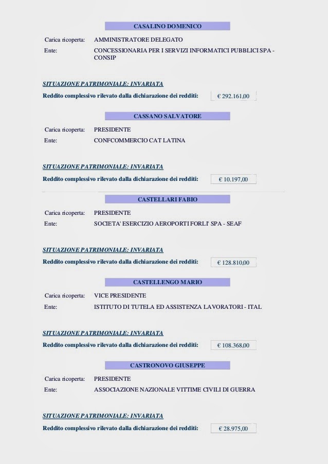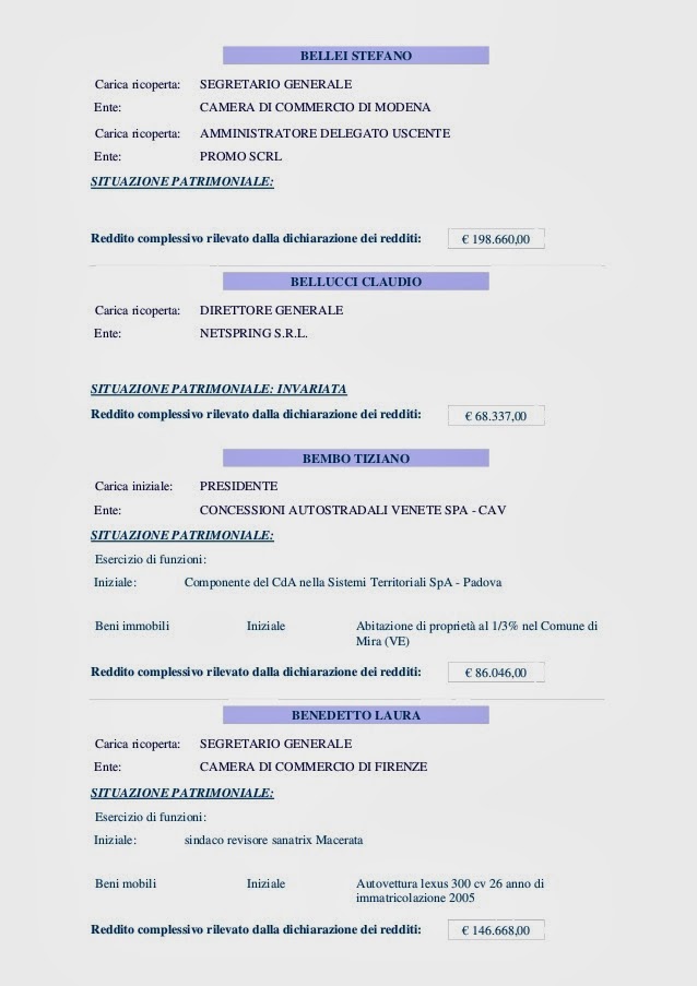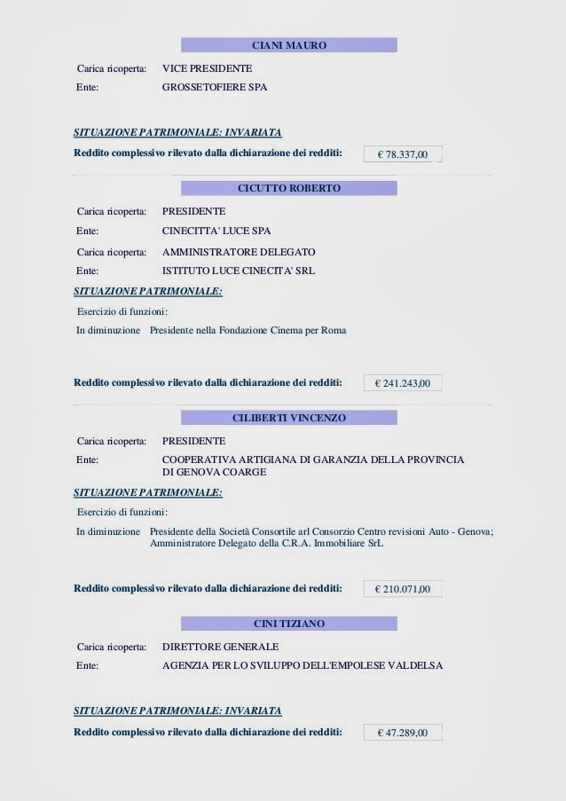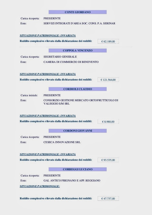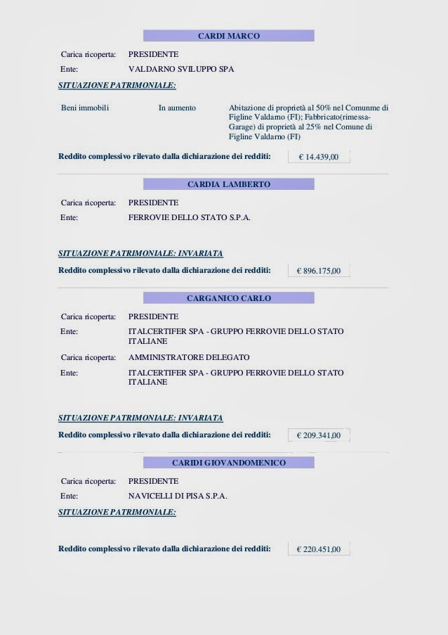 E’ UN DOVERE, ALLORA, FORNINE ALLA RETE TALE DOCUMENTAZIONE, IN MODO CHE CHIUNQUE LA POSSA CONSULTARE, FOGLIO PER FOGLIO, NOME PER NOME, CON INCARICHI, POLTRONE OCCUPATE, NOMINE VARIE, PATRIMONIO IMMOBILIARE E ACCESSORI E REDDITO TOTALE PER L’ANNO ANALIZZATO.