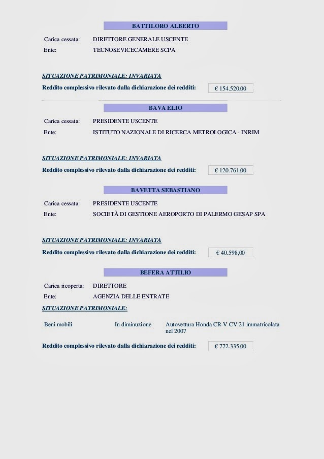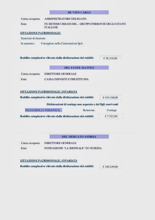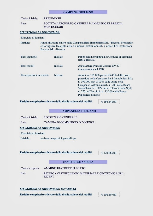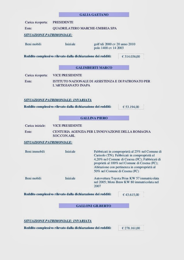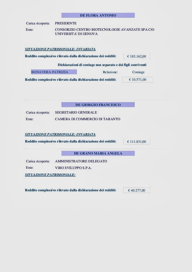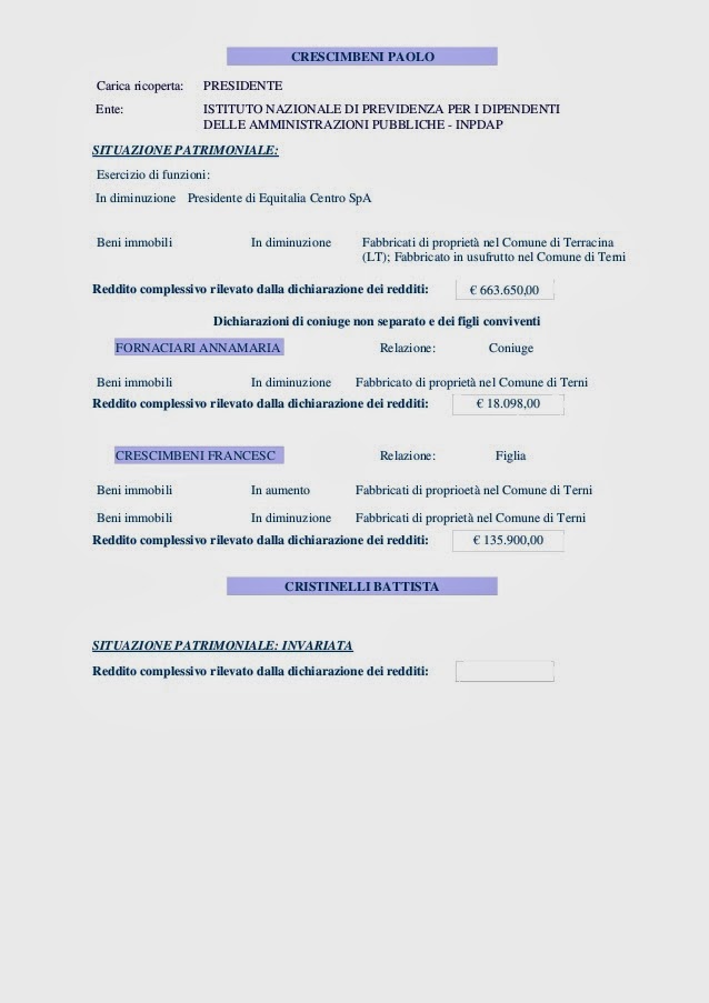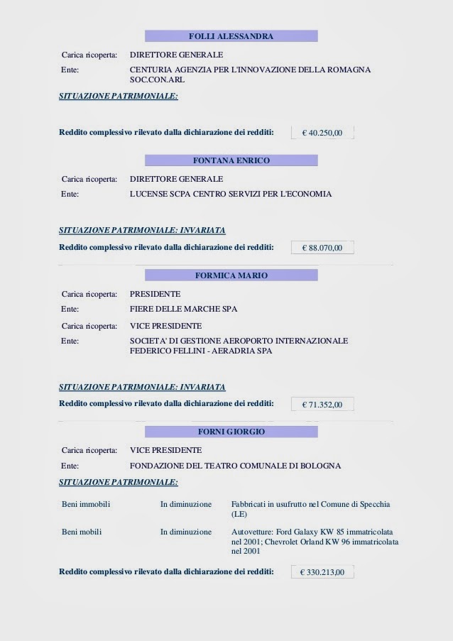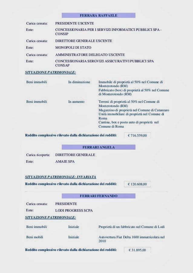 E’ UN DOVERE, ALLORA, FORNINE ALLA RETE TALE DOCUMENTAZIONE, IN MODO CHE CHIUNQUE LA POSSA CONSULTARE, FOGLIO PER FOGLIO, NOME PER NOME, CON INCARICHI, POLTRONE OCCUPATE, NOMINE VARIE, PATRIMONIO IMMOBILIARE E ACCESSORI E REDDITO TOTALE PER L’ANNO ANALIZZATO.