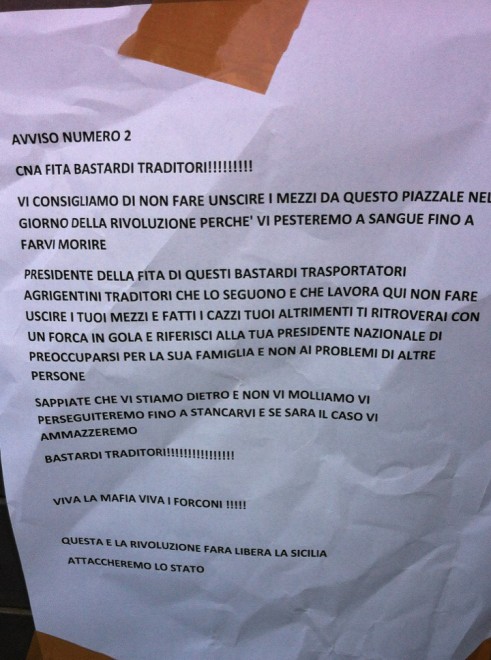 L’avviso contiene una serie di minacce e intimidazioni esplicite indirizzate sia al presidente provinciale che al presidente nazionale della Fita Cna, dopo che l’organizzazione si e’ espressa contro i blocchi degli autotrasportatori annunciato dal movimento dei Forconi.