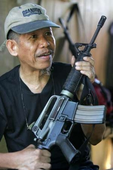 Gregorio Rosal, altrimenti detto ’Ka Roger ’, portavoce principale del ’Nuovo Esercito Filippino del Popolo’, stringe un fucile automatico durante l’intervista alla Reuters nella provincia montagnosa di Luzon del sud - 29 aprile 2006. Rosal ha detto sabato che il successo recente dei Maoisti in Nepal ha amplificato il morale fra gli insorgenti comunisti filippini. - REUTERS/Romeo Ranoco