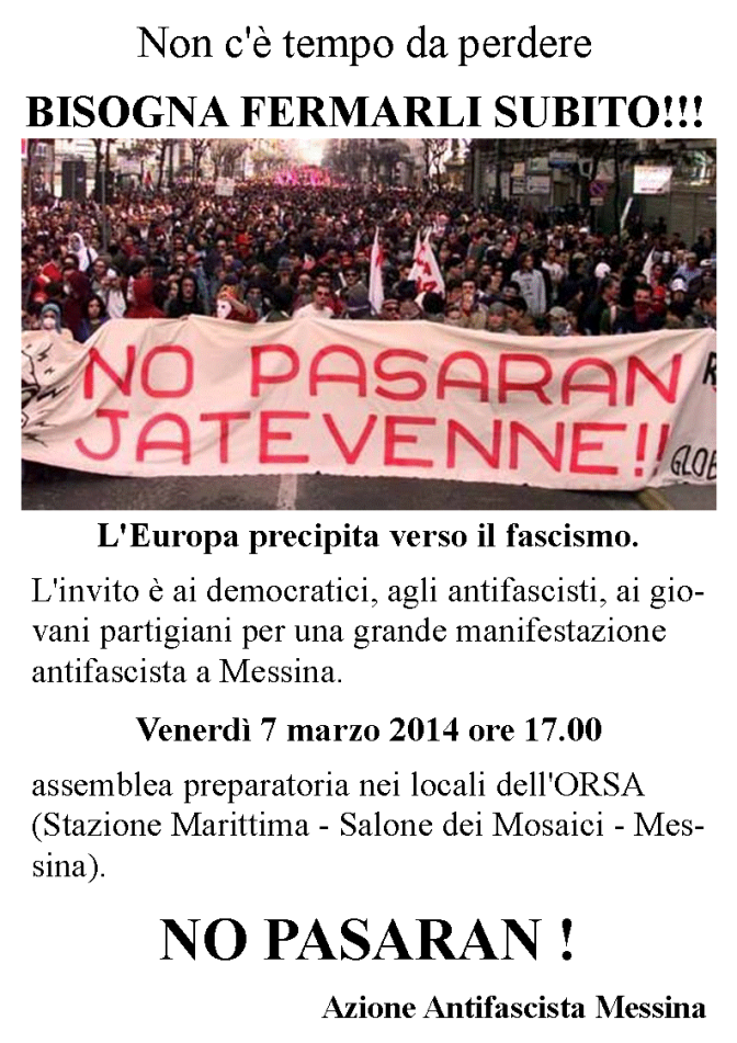 Appuntamento venerdì 7 marzo 2014 alle ore 17 presso il sindacato Orsa (Stazione Marittima – Salone dei Mosaici – Messina) per l’assemblea preparatoria della manifestazione antifascista.