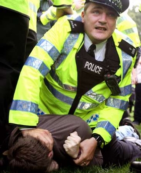 A protester is restrained by a policeman during a demonstration in Parliament Square, London October 9, 2006. The protest was timed to disrupt members of parliament as they returned to their Parliamentary offices for the first working day after the summer recess. REUTERS/Eddie Keogh (BRITAIN)