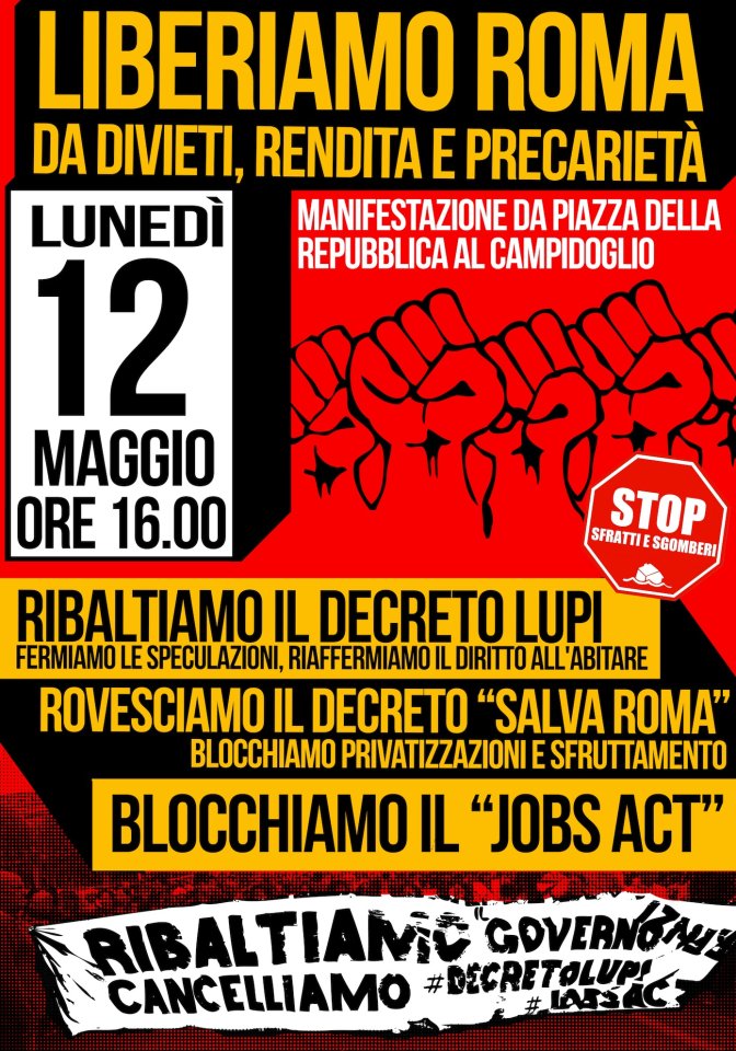 Publie le mercoledì 7 maggio 2014 par Movimenti per il diritto all’abitare e contro la precarietà e l’austerity - Open-PublishingLiberiamo Roma da divieti, rendita e precarietà: lunedì 12 maggio manifestazione cittadina ore 16 da Piazza della Repubblica