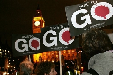 Hundreds of anti war protesters demonstrate outside Houses of Parliament in London, Tuesday, Oct. 31, 2006. Prime Minister Tony Blair faced a new challenge to his authority Tuesday as lawmakers debated the role of coalition troops in Iraq for the first time since the 2003 U.S.-led invasion and planned to vote on a proposal for an immediate inquiry into Britain’s role in the conflict. (AP Photo/Sang Tan)