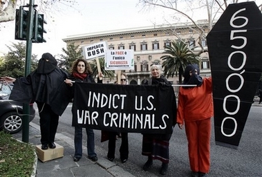 U.S. Citizens for Peace and Justice movement activists hold banners in front of Rome’s U.S. Embassy to Italy, Saturday, Jan. 27, 2007, to protest the presence of U.S. troops in Iraq and to demand that the newly elected congress refuse to fund the Bush administration wars. The number on the banner at right refers to the Iraqis who reportedly died since the start of the war in Iraq.