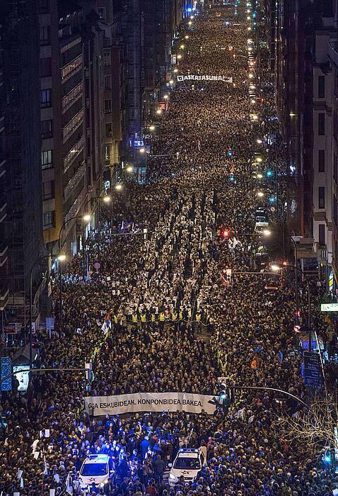 La più grande manifestazione degli ultimi decenni nel Paese Basco. Mentre scriviamo a decine di migliaia stanno ancora sfilando nelle strade del centro della maggiore città basca mentre la testa è già da tempo arrivata davanti al Municipio in quella che doveva essere una manifestazione per il rimpatrio dei prigionieri politici e la difesa dei loro diritti violati dal governo spagnolo e che nel giro di poche ore è stata trasformata da Madrid in un inequivocabile e determinato ‘no’ alla dittatura.