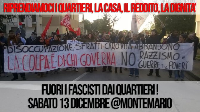 Nei limitrofi quartieri di Primavalle e Torrevecchia, come in tanti altri quartieri popolari in tutta Italia, nelle scorse settimane abbiamo cominciato a sperimentare forme di lotta comuni tra tutti questi soggetti. Pensiamo che impedire ai fascisti, mafiosi e speculatori di portare il razzismo nelle nostre strade sia un passo di questa lotta, un modo per opporci tanto all’art 3 del piano lupi che prevede la vendita all’asta delle case popolari, tanto all’art 5 che attacca in modo indiscriminato le occupazioni. Insieme a lavoratori e lavoratrici, occupanti e inquilini, studenti e disoccupati vogliamo riprenderci il nostro diritto di vivere con dignità la città e di muoverci senza paura nei nostri quartieri.Chi ha voluto dividerci ci troverà nelle strade più uniti di prima,per ribadire che nei nostri quartieri non c’è spazio per il fascismo e non ci sarà mai.