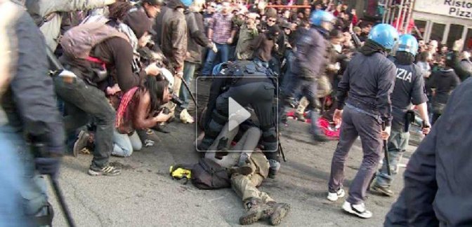 Publie le domenica 13 aprile 2014 par Open-PublishingÈ Dina Lauricella, l’inviata di Servizio Pubblico, ad aver filmato questa scena raccapricciante: un esponente delle forze dell’ordine, probabilmente un dirigente della Polizia da quello che si vede dalla immagini, ha camminato – senza alcuna ragione specifica – sulla testa di un manifestante. E il corteo per il diritto alla casa si è trasformato in guerriglia urbana: scene di ordinaria follia nell’Italia che va a pezzi.