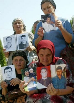 Women hold portraits of missing relatives during a protest demanding the authorities solve the question of the fate of their loved ones, in Grozny August 30, 2006. Rights groups say hundreds of Chechens have gone missing since Russian troops went back into Chechnya in 1999. REUTERS/Said Tsarnayev (RUSSIA)